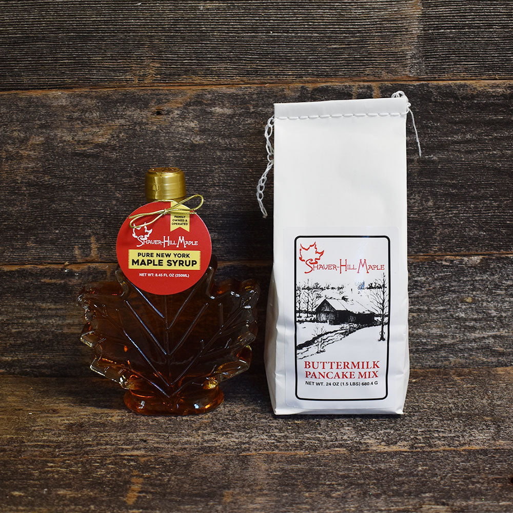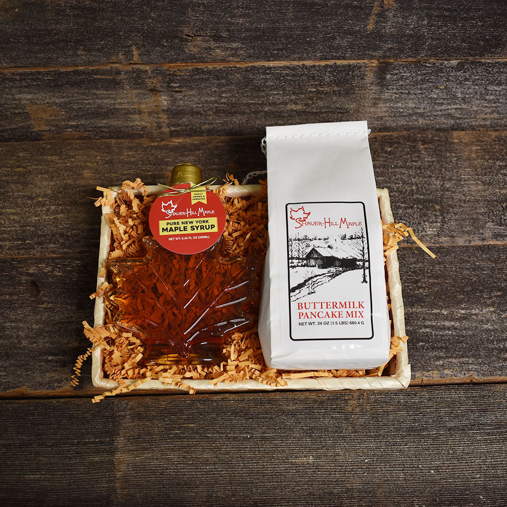 A charming breakfast classic, beautifully presented. Drizzle our pure New York maple syrup from the iconic glass maple leaf bottle over hot, fluffy pancakes made with our buttermilk mix. Simple, elevated, and always appreciated—an easy win for client gifts, team appreciation, or anyone who loves a maple-laced morning.